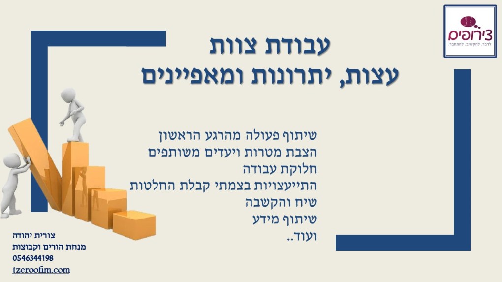 נושאים נוספים: איתור ומינוף חוזקות אישיות בצוות, לדעת להתייעץ, שימת דגש על היתרונות הרבים בעבודת הצוות.
